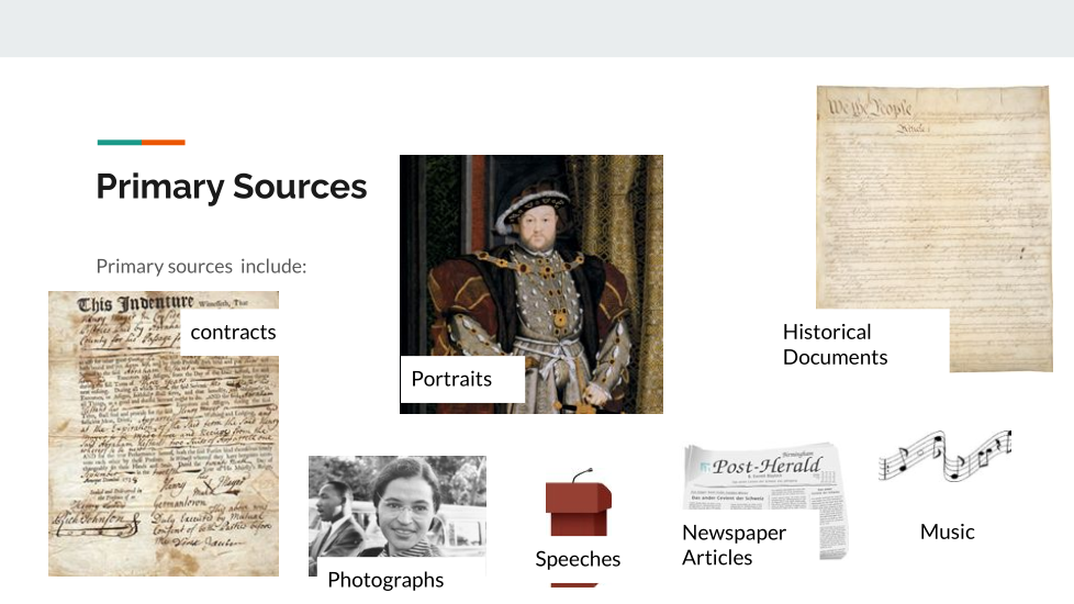 Primary sources are the original records of a specific time in history. A first-hand account.