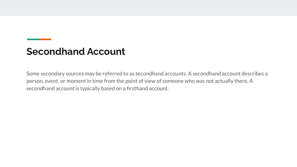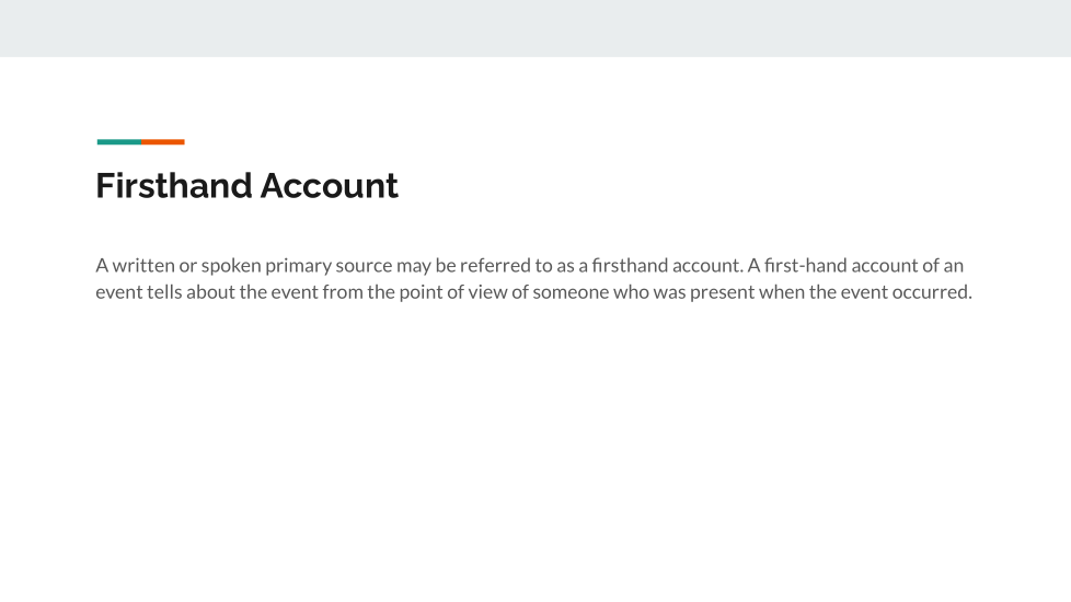 A written or spoken primary sources may be referred to as a firsthand account. A first-hand account of an event tells about the event from the point of view of someone who was present when the event occurred.