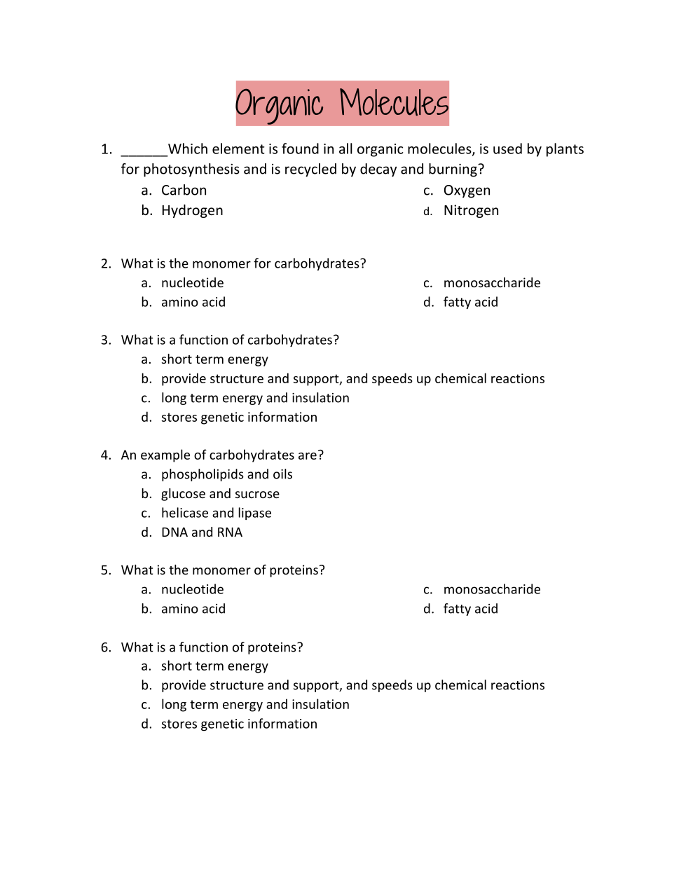 Which element is found in all organic molecules, is used by plants for photosynthesis and is recycled by decay and burning?