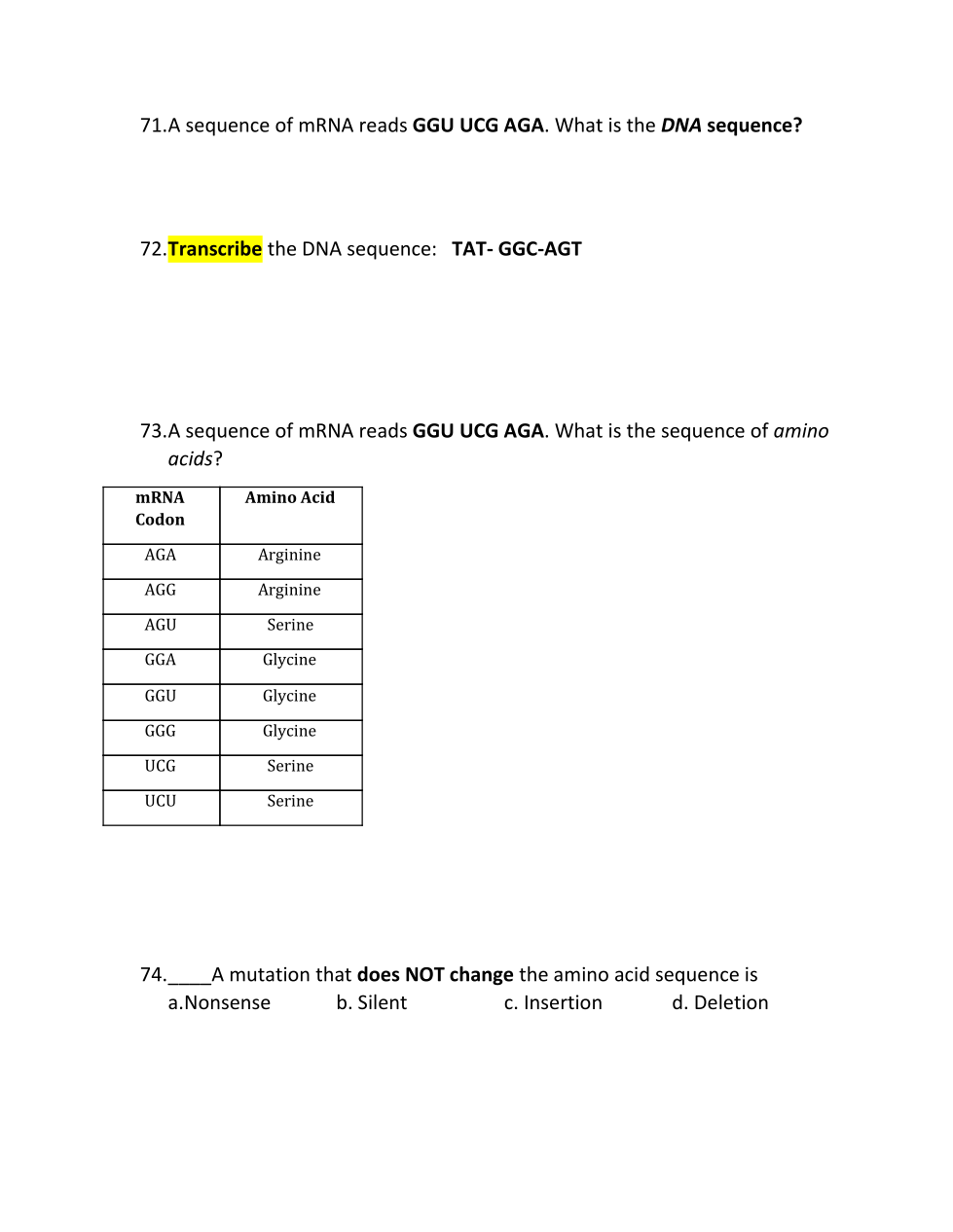A sequence of mRNA reads GGU UCG AGA. What is the sequence of amino acids?