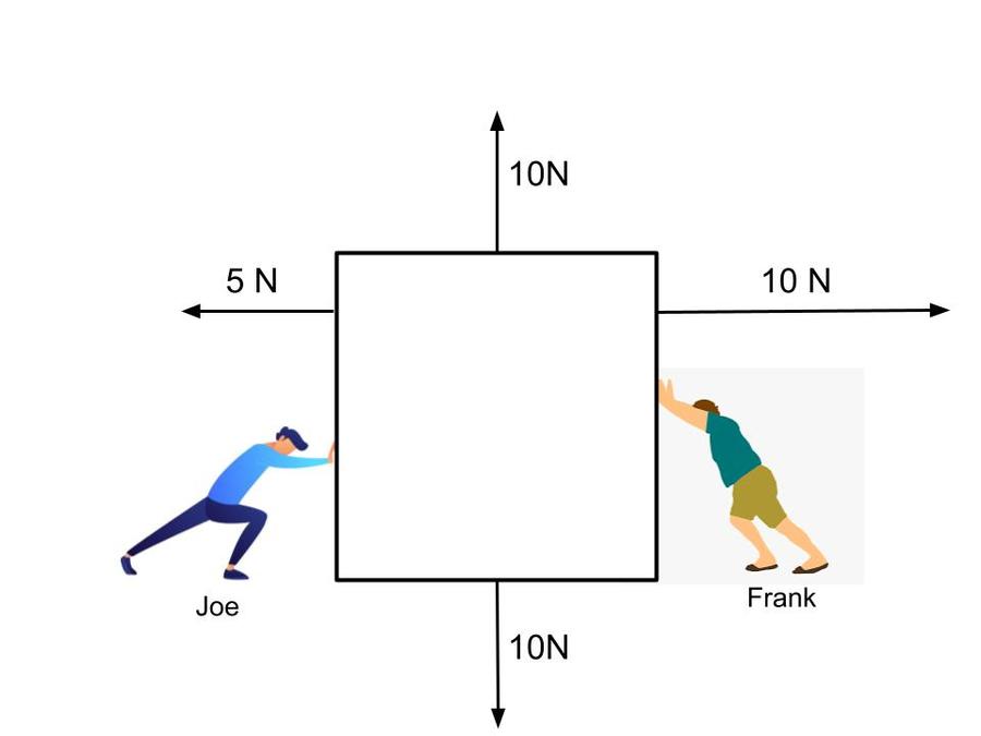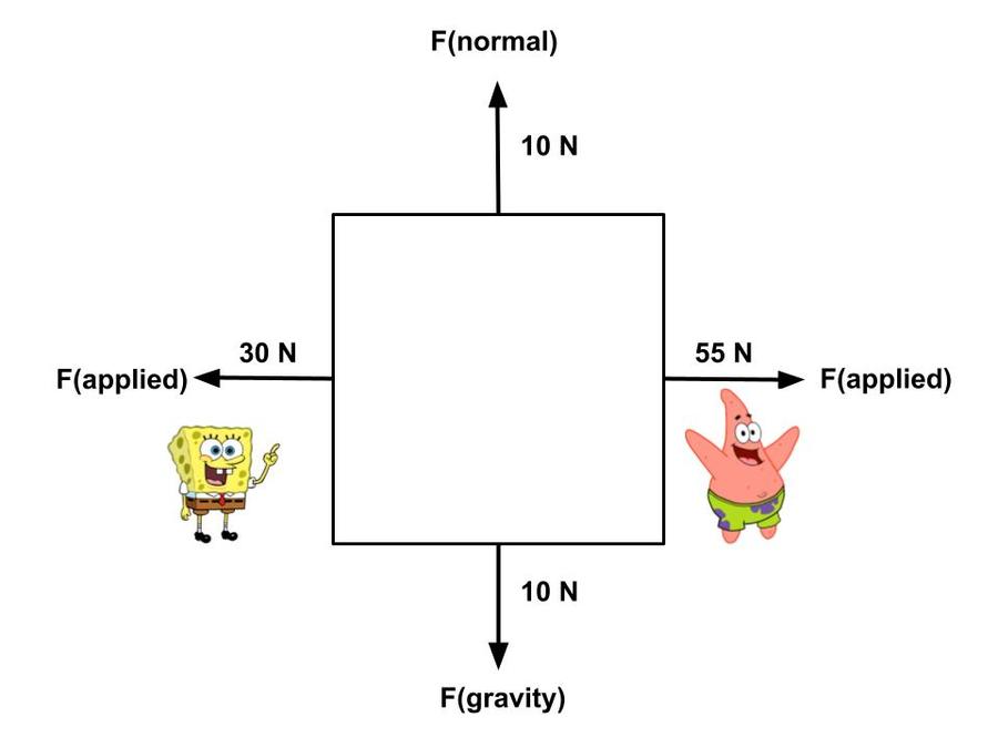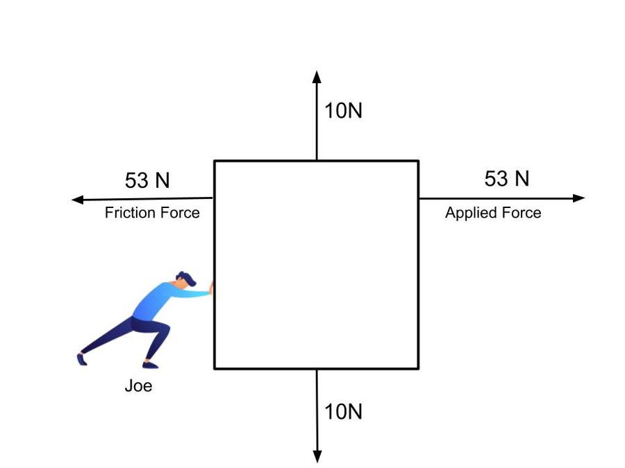 If the guy is pushing the box with a force of 25 N, and the friction force on the box is 15 N, what is the Net force he is pushing the box?