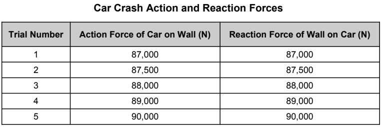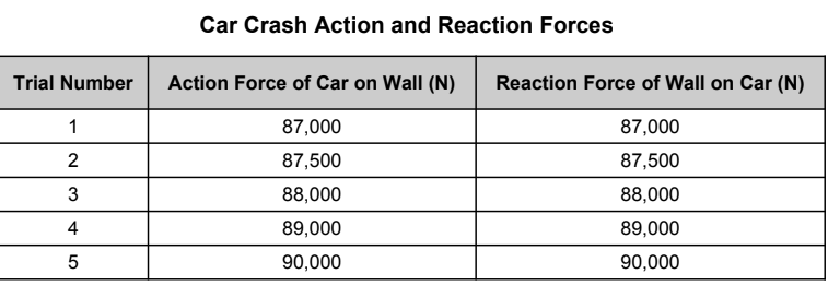 In a crash test, cars hit a wall with varying amounts of force. The action and reaction forces are recorded in the table below.