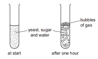 Some yeast, sugar and water are mixed in a test-tube. The diagrams show the test-tube at the start and after one hour.