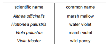 The table shows the scientific names and the common names of four plants.
