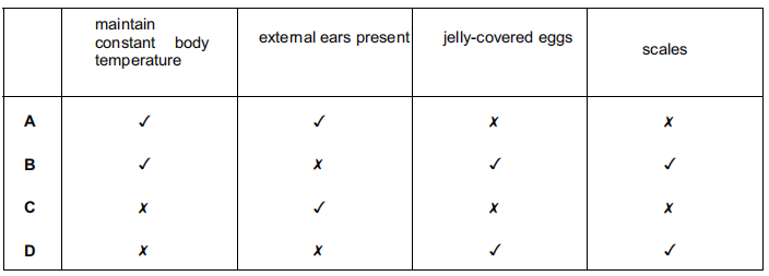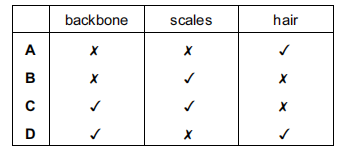 Which of the organisms A–D, identified by the key, represents a reptile?