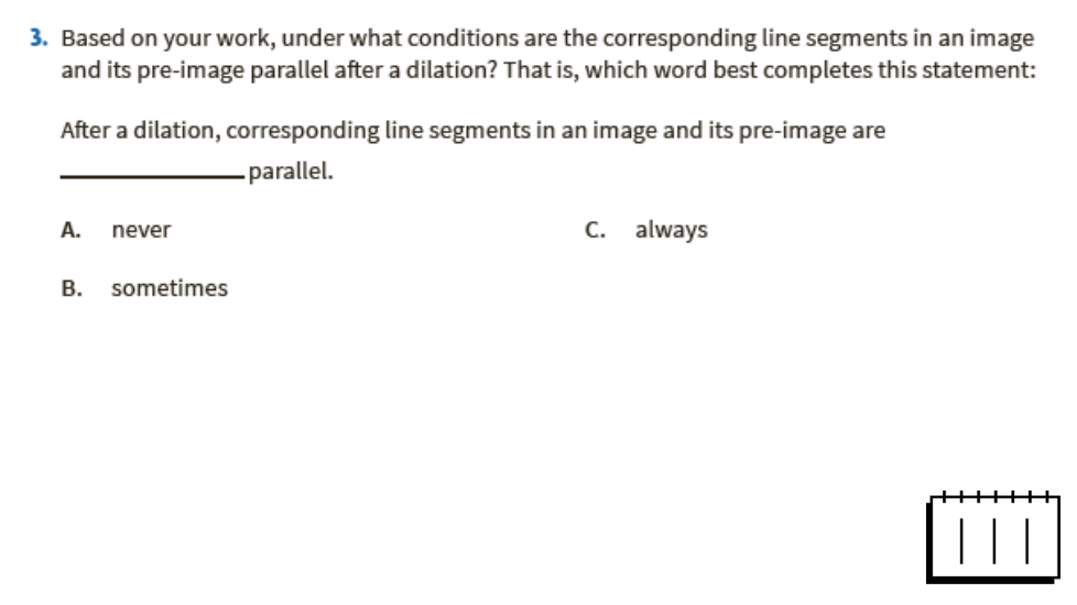 Give reasons for your answer. If you choose “sometimes,” be very clear in your explanation how to tell when the corresponding line segments before and after the dilation are parallel and when they are not.