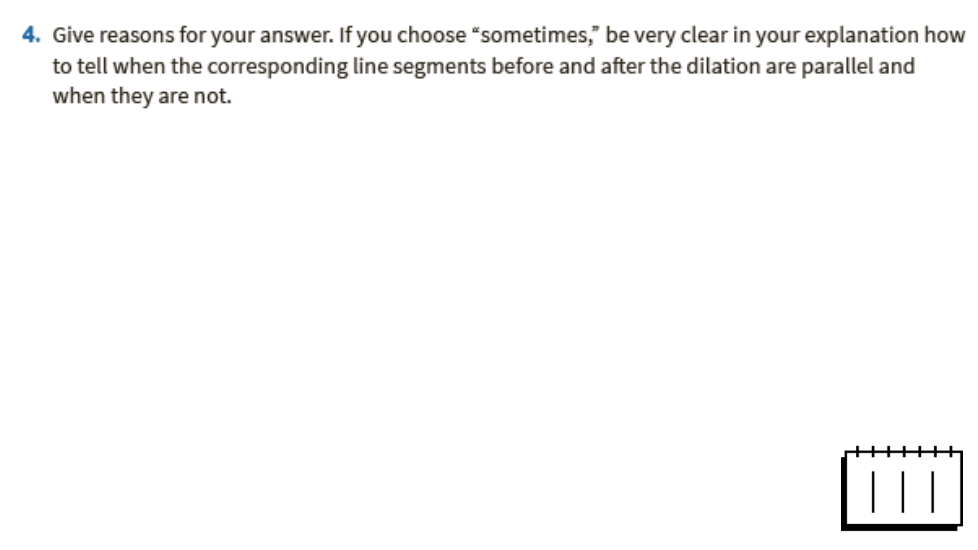 Justifica tu respuesta. Si elige "a veces", sea muy claro en su explicación sobre cómo saber cuándo los segmentos de línea correspondientes antes y después de la dilatación son paralelos y cuándo no lo son.