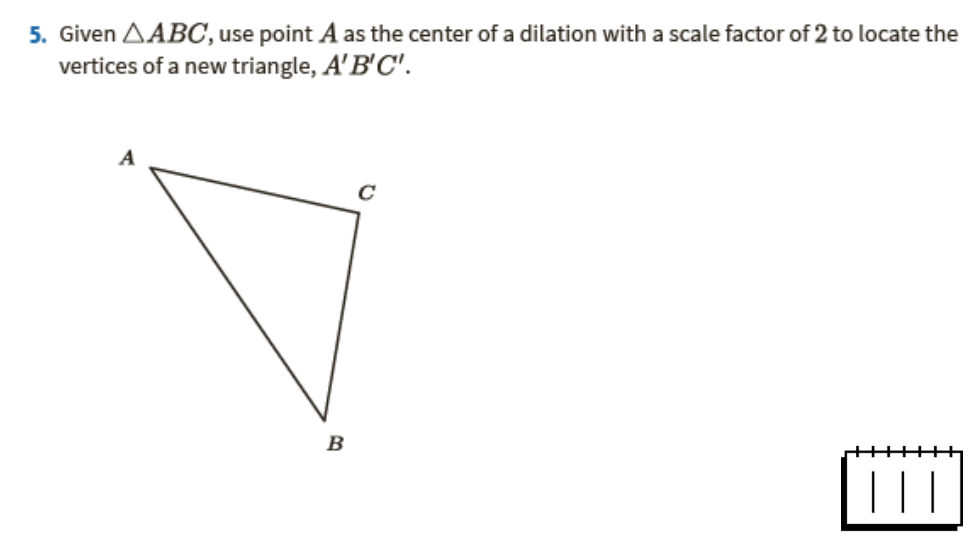 usa el punto A como el centro de una dilatación con un factor de escala de 2 para ubicar los vértices de un nuevo triángulo, A'B'C'.