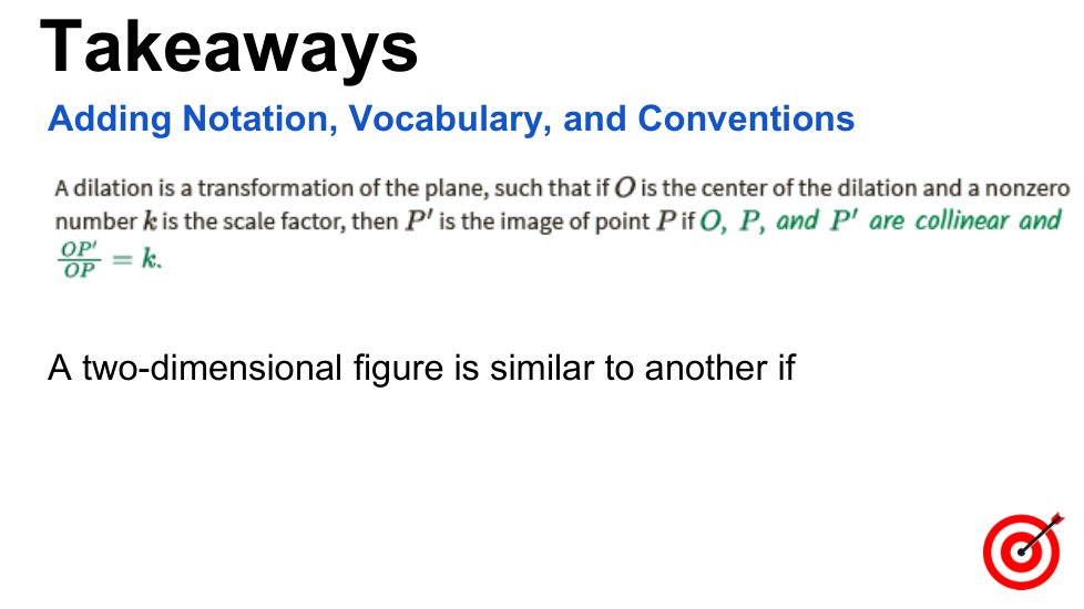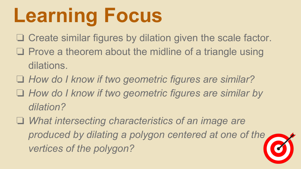 In this lesson, we extended our understanding of similar figures. Since corresponding segments of similar figures are proportional, and dilations produce similar figures, corresponding parts of an image and its pre-image after a dilation are proportional. We also learned that corresponding line segments in a dilation are parallel. These two observations provided a tool for proving a theorem about a midline of a triangle, a segment connecting the midpoints of two sides of a triangle.