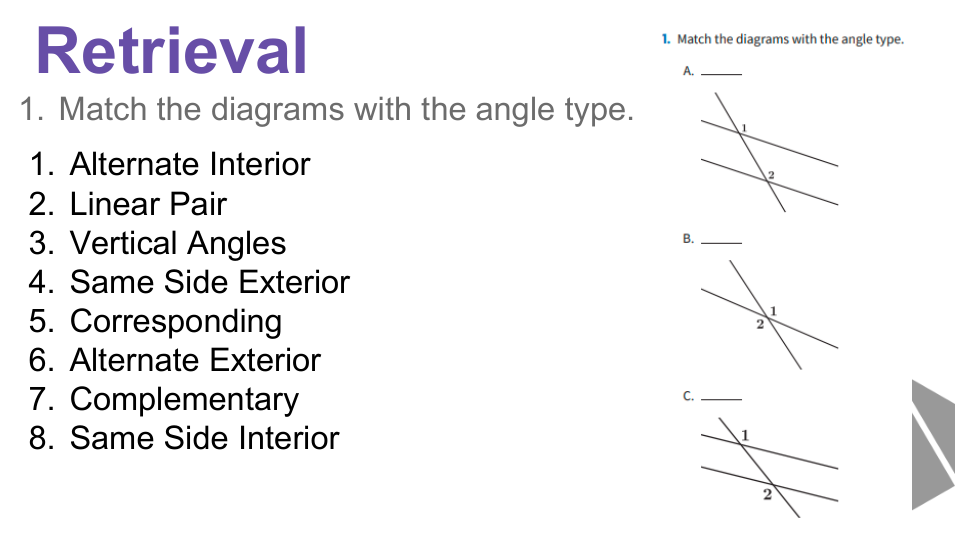Match the diagrams below with the best name or phrase that describes the angles.