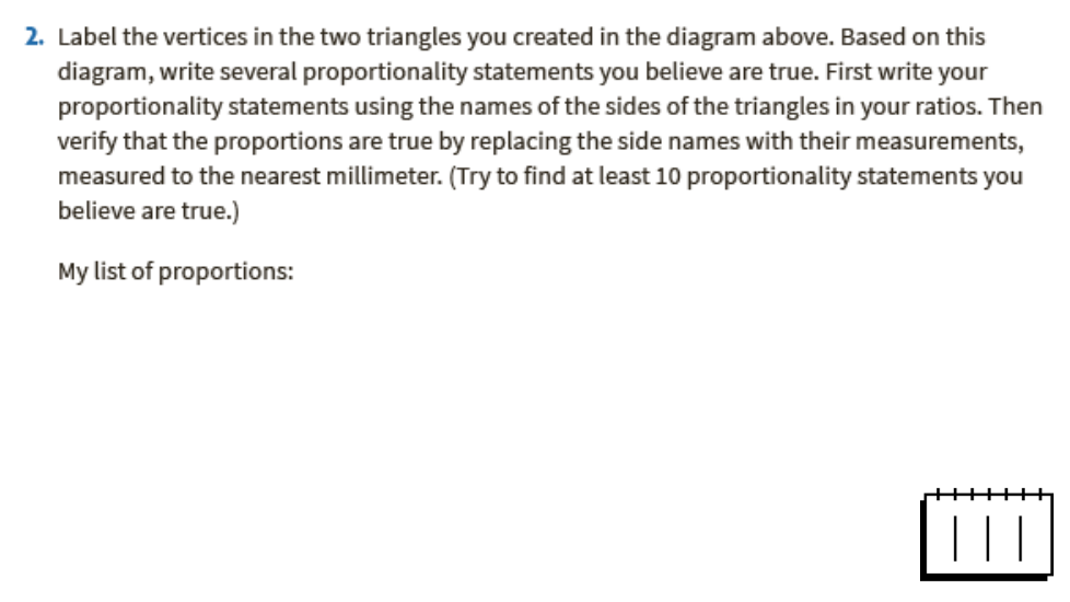 Etiqueta los vértices en los dos triángulos que creaste en el diagrama de arriba. Basándote en este diagrama, escribe varias afirmaciones de proporcionalidad que creas que son verdaderas. Primero escribe tus enunciados de proporcionalidad usando los nombres de los lados de los triángulos en tus razones. Luego verifique que las proporciones sean verdaderas reemplazando los nombres de los lados con sus medidas, medidas al milímetro más cercano. (Trate de encontrar al menos 10 afirmaciones de proporcionalidad que crea que son verdaderas).