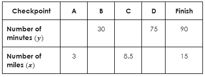 a) Complete the table to show Shaun's time, in minutes, and distance, in miles at each checkpoint.