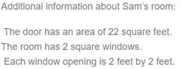 b) Sam needs to figure out how much paint to buy. Calculate for her the total area, in square feet, of the four walls. She will not paint the doors or windows.