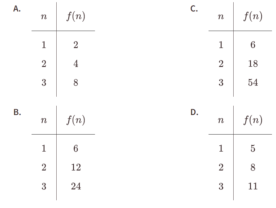 Seleccione la(s) tabla(s) de valores que representa(n) la función explícita f(n) = 2 * 3n