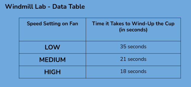 Reasoning (create an argument to explain what kind of wind speed you would need to place a windmill in to get the most kinetic energy based on your experiment results):