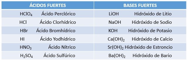 Elija la respuesta que corresponda, según los ácidos y bases fuertes: