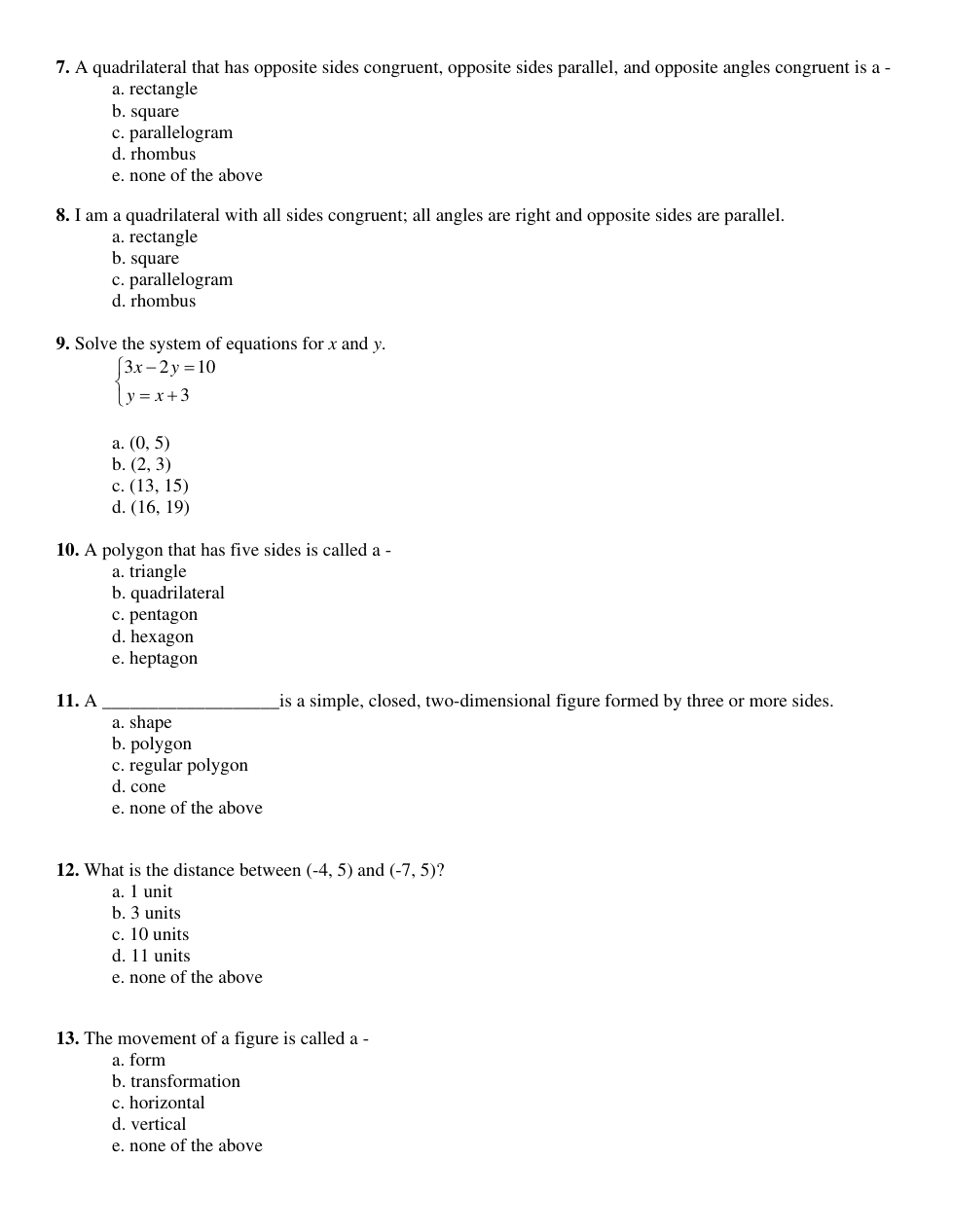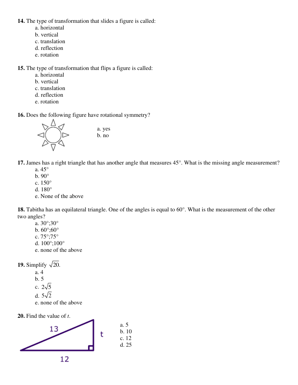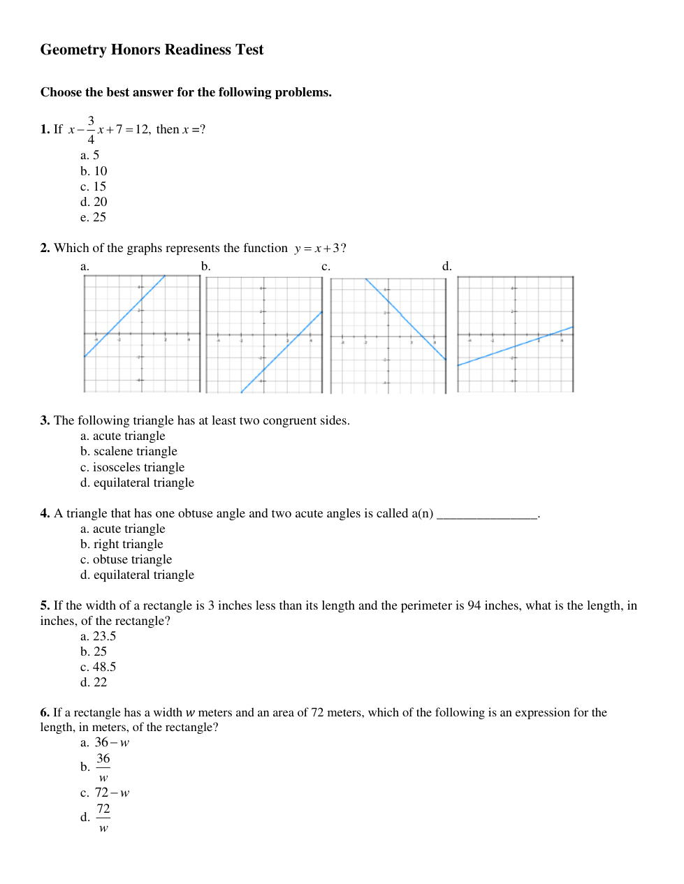 Honors Geometry Readiness Test