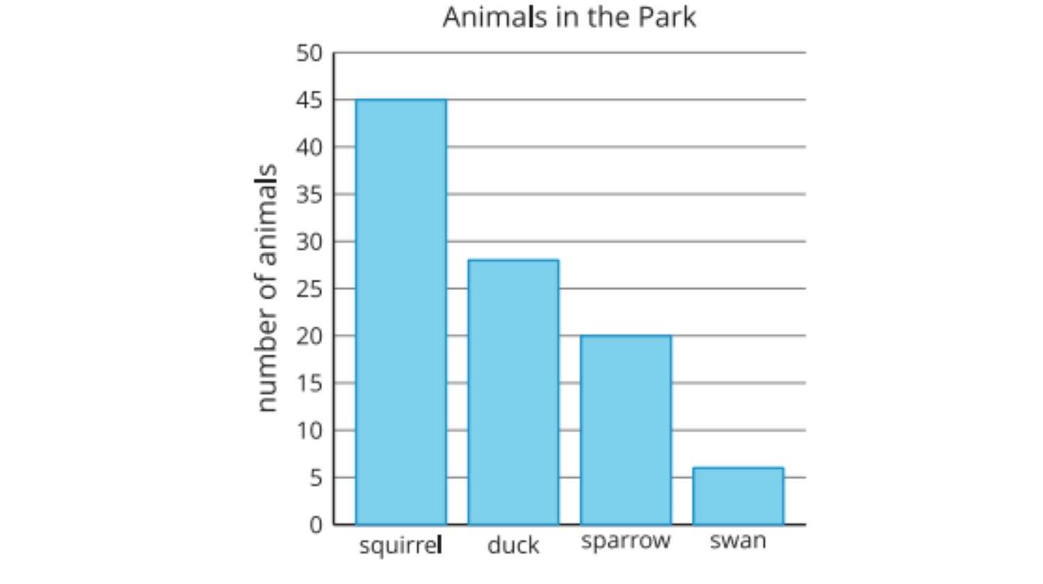 The bar graph shows the number of different animals at a park. a. How many squirrels and sparrows are there altogether? Explain or show your reasoning.