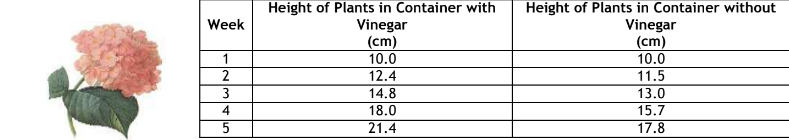 Maggie read that some plants grow better if the soil is acidic. She can’t believe that a plant can grow when exposed to acid. Maggie decides to test if the plants she has will grow better when acid is added to the soil. She puts potting soil in two planting containers and transplants two of her geraniums that seem about the same size into the pots. She puts the pots in the same location so that they both get the same sunlight each day, are at the same temperature and she makes sure they get the same amount of water. However, Maggie puts a tablespoon of vinegar in the water she gives to one of the plants. She measures the growth of the plants every week for five weeks and records the results in a data table below: