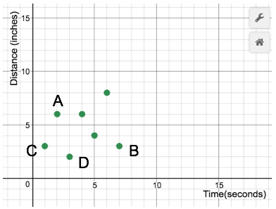 Which dot on the graph is most closely associated with time = 6 seconds and distance = 7 inches? *associated can mean "connected to"