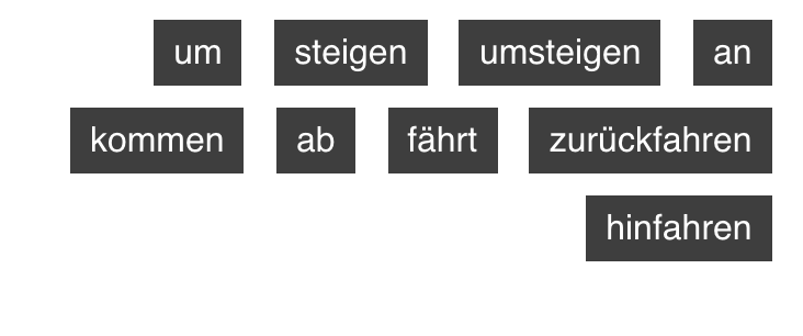 DB: Ja, einen Moment bitte. Hier, dieser Zug.......................(3) am 5. November um 8:30 Uhr und Sie....................(4) um 10:45 Uhr in Bingen am Rhein.........................(5). Sie müssen einmal............................(6), und zwar in Koblenz.