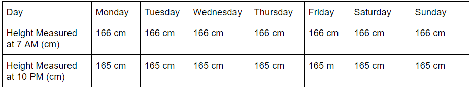 To find out, Arnaldo carefully measured his height at 7 AM and at 10 PM every day for a week. He recorded his measurements using a table: | arrow_right_alt | Define a Question |