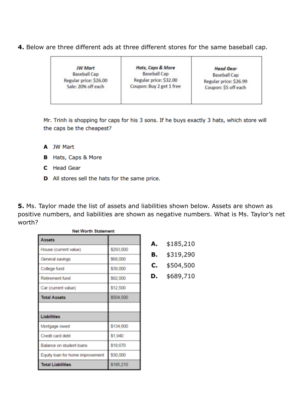 Below are three different ads at three different stores for the same baseball cap. For which store will the caps be the cheapest?