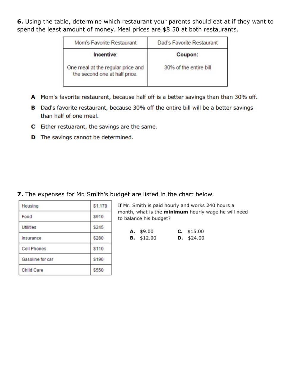 Using the table, determine which restaurant your parents should eat at if they want to spend the least amount of money. Meal prices are $8.50 at both restaurants.
