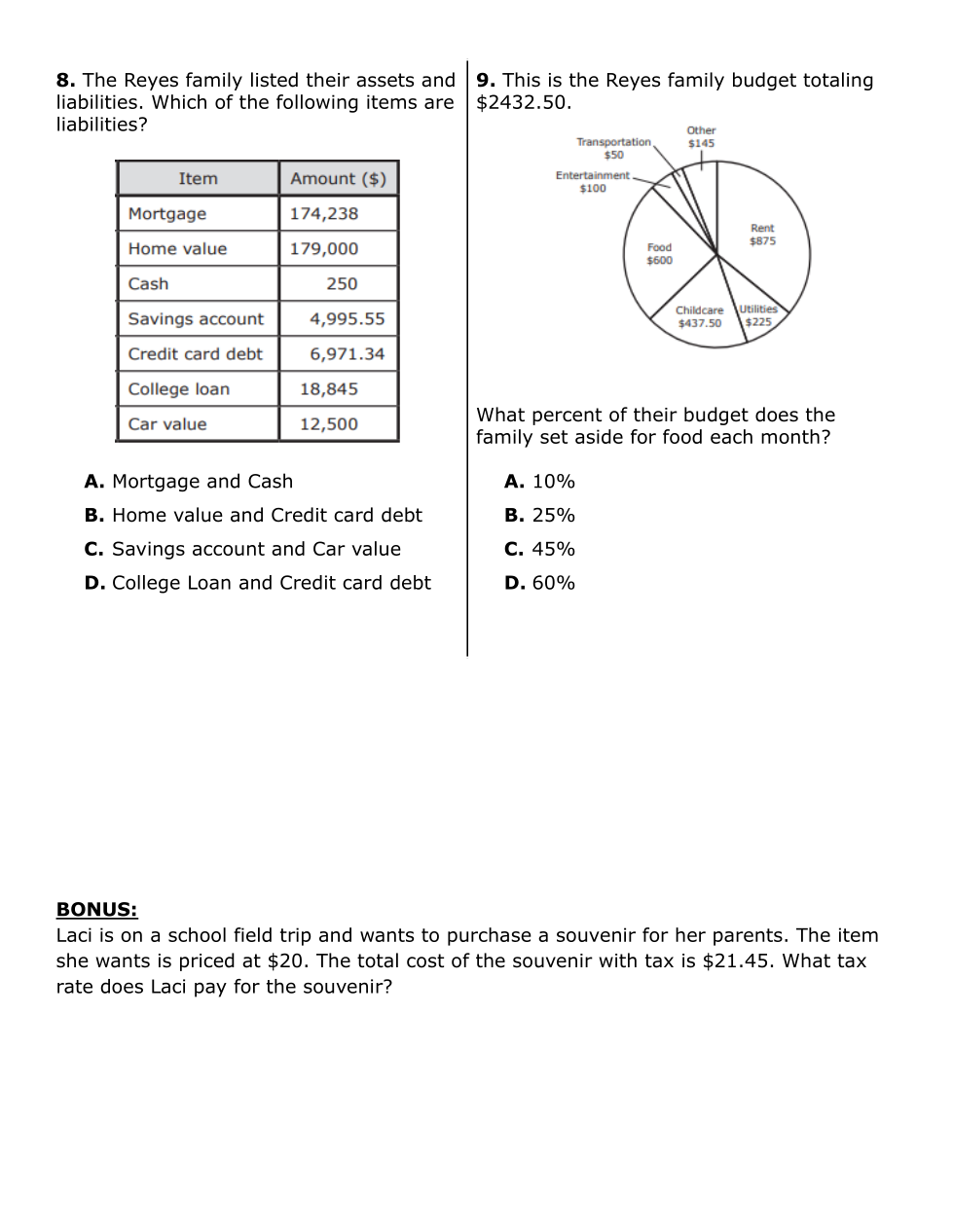 The Reyes family listed their assets and liabilities. Which of the following items are liabilities?