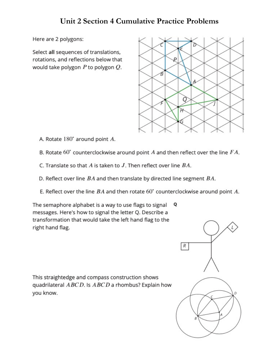 Select all sequences of translations, rotations, and reflections that would take polygon P to polygon Q.