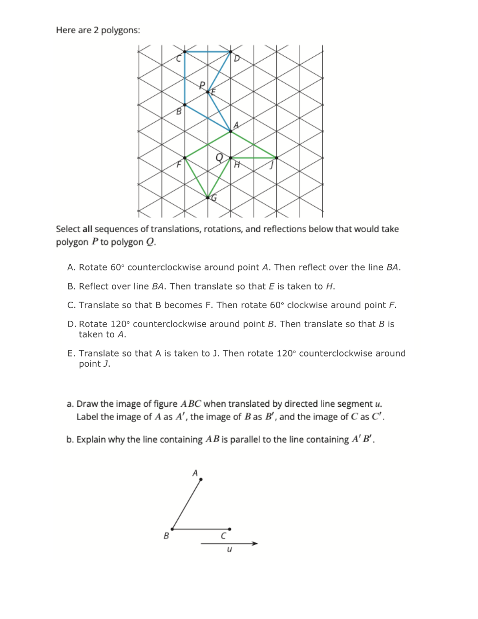 Select all sequences of translations, rotations, and reflections that would take polygon P to polygon Q.