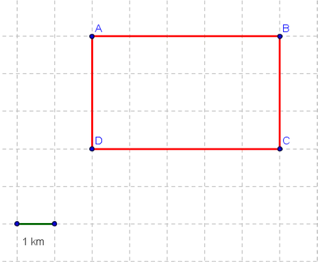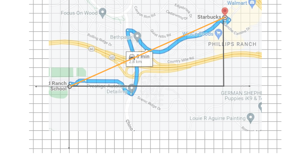 To the left we can see the route from Diamond Ranch to the Starbucks at Rio Rancho from Google maps. According to Google maps the route (the blue line) has a distance of 2.8 km, but we want to find the displacement (the orange line). First we establish a frame of reference, by putting the map on a grid. We set the location of Diamond Ranch at (0,0). Our x axis runs from west to east. Our y axis runs from south to north. Each square represents 10,000 m2 (100 m a side)