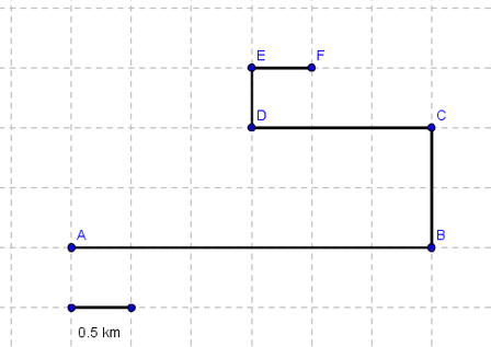 An object moves along the grid through the points A, B, C, D, E, and F as shown below.