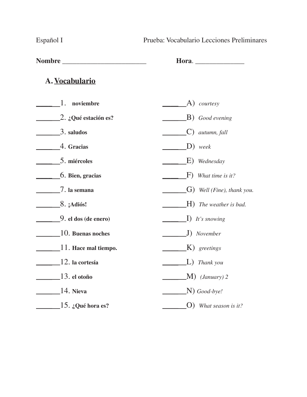 A) Match your vocabulary words with the correct translation. Pay attention to your tildes and spelling, you will loose points if not done correctly.