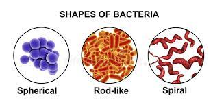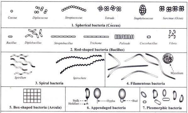 When viewed under light microscope, most bacteria appear in variations of three major shapes: the rod (bacillus), the sphere (coccus) and the spiral type (vibrio).