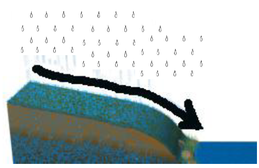 The process where water flows/runs downhill from land surfaces into rivers and streams and then back to the ocean. Powered by gravity. | arrow_right_alt | Run off |