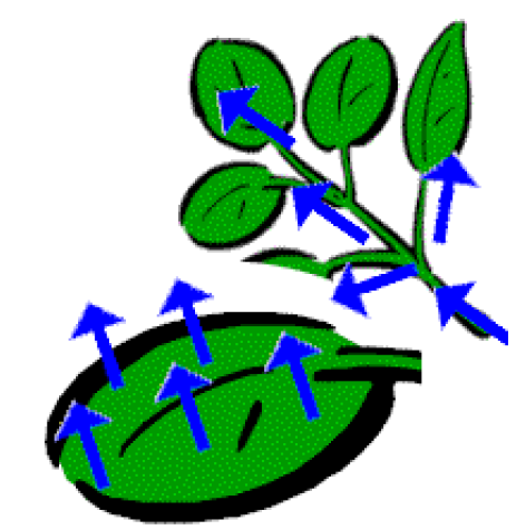 The process of water inside a plant leaf evaporating. Powered by the sun. | arrow_right_alt | Transpiration |