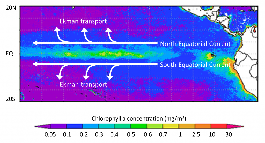 The upwelled water is cold and rich in nutrients. Many of the most productive regions on Earth are found in upwelling zones. In the equatorial Pacific, the trade winds blow the North and South Equatorial Currents towards the west, while Ekman transport causes the upper layers to move to the north and south in their respective hemispheres.