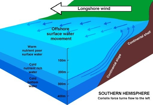 Upwelling also occur along coasts, when winds move water away from the coastline. The water displaced near the coast is replaced by cold, nutrient-rich deeper water that is brought to the surface through upwelling, leading to high productivity.