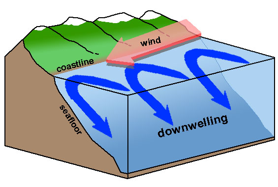 Downwelling also occur along coasts, when winds move water towards the coastline. The concentrations of nutrients decreases as the nutrient poor surface water is added to the deep waters.