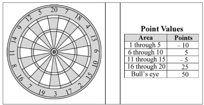 Toni is playing a game of darts where different areas of the dartboard are worth different amounts of points.