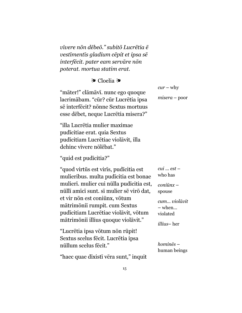 “quia Sextus pudīcitiam meam violāvit,” inquit mulier tristissima, “vōtum mātrimōniī rūpī. ego dehinc vīvere nōn dēbeō.”