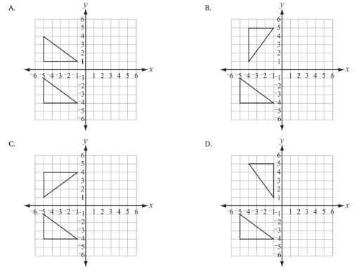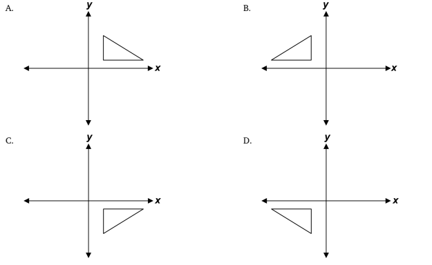 Which figure shows the triangle below reflected over the x-axis, THEN reflected over the y-axis?