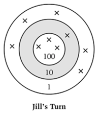 Jill threw 9 darts. Each X marks a spot where one of Jill’s darts landed. What was Jill’s score?