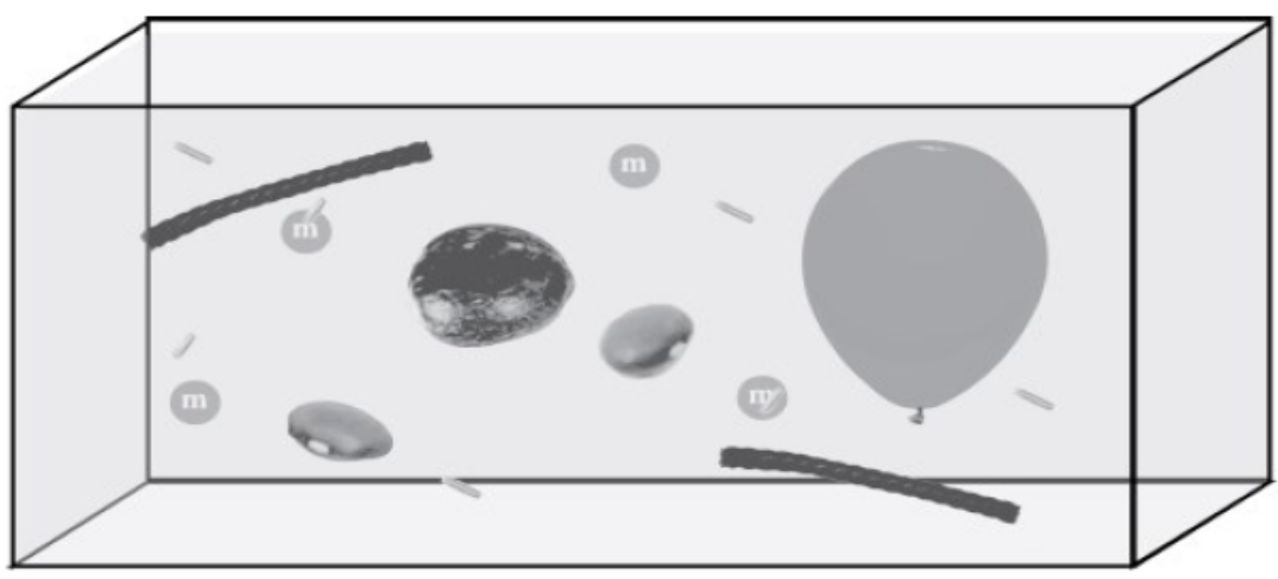 You make a model of a cell in a large, rectangular, clear, plastic container filled with the following: gelatin; green M&Ms; red licorice; several beans; one large, inflated balloon; candy sprinkles; and an avocado seed.