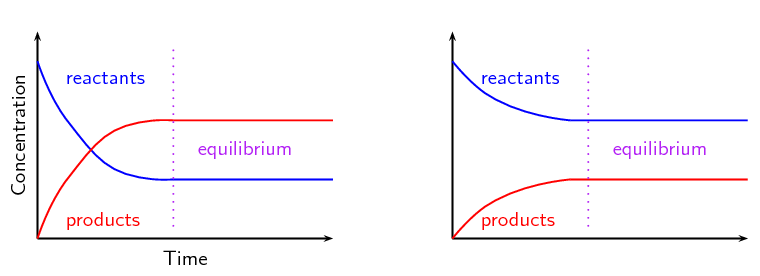 Explain in your own words, how to read this concentration/time graph. Include key vocabulary and explain how to tell if a reaction has reached equilibrium.