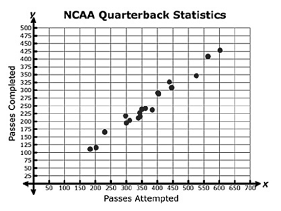 The scatter plot shows the NCAA Quarterback statistics for the number of passes attempted to the number of passes completed. Answer the questions as true or false. IF it is false tell me why.
