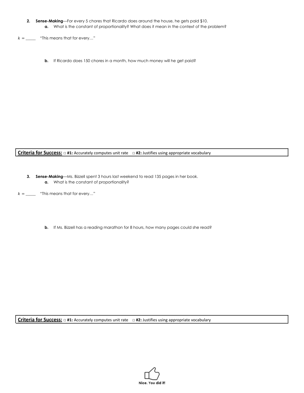 What is the constant of proportionality? What does it mean in the context of the problem?k= _____ “This means that for every…”