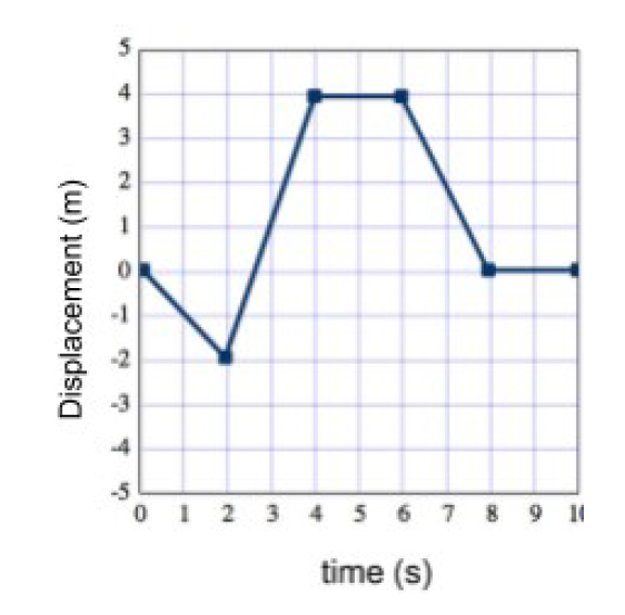 The graph describes a cat’s displacement as it runs along a wall. What is the cat’s displacement at 7 seconds?