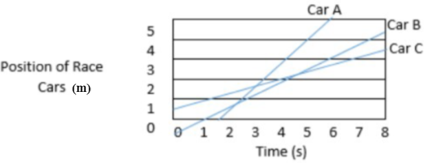 In the distance time graph of the three race cars, which car has the lead at time = 1 second?
